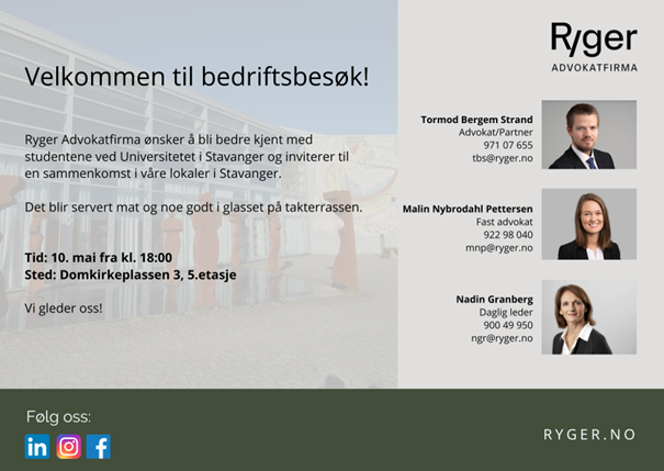 Ryger Advokatfirmaet ønsker å bli bedre kjent med studentene ved Universitetet i Stavanger og inviterer til en sammenkomst i sine lokaler i Stavanger.